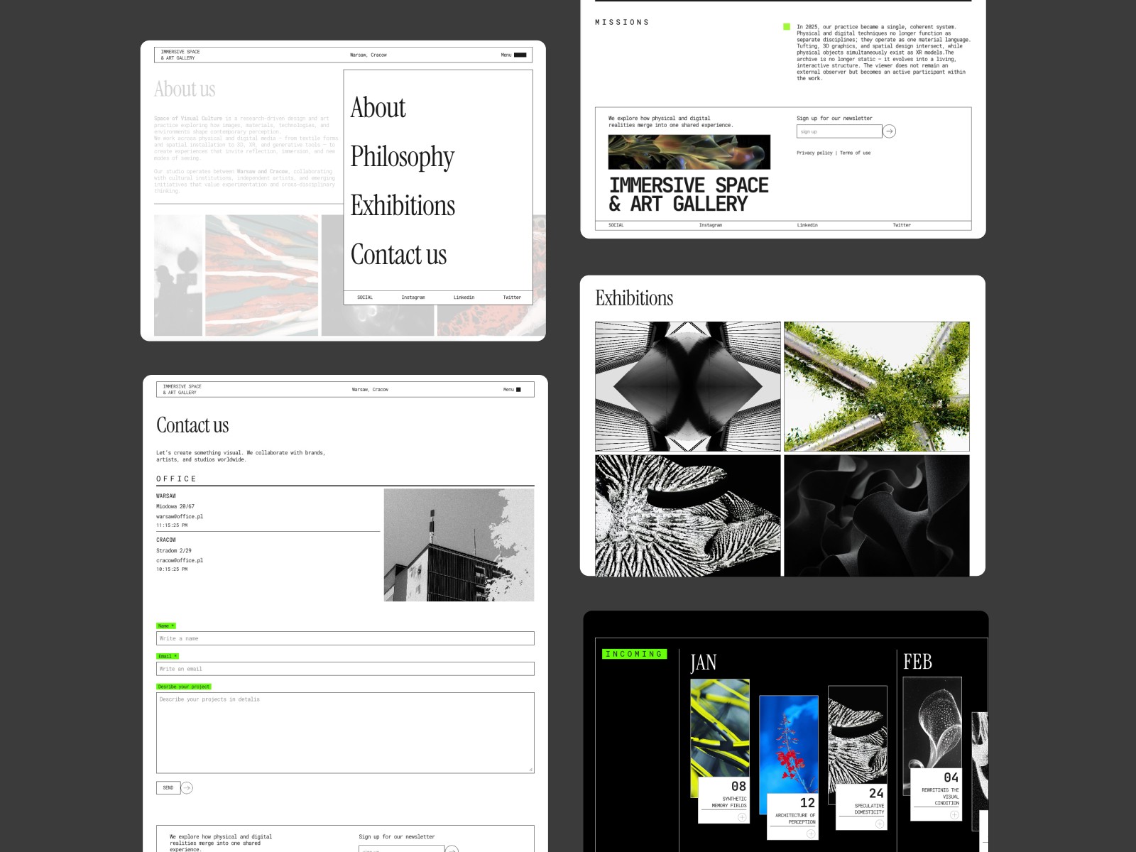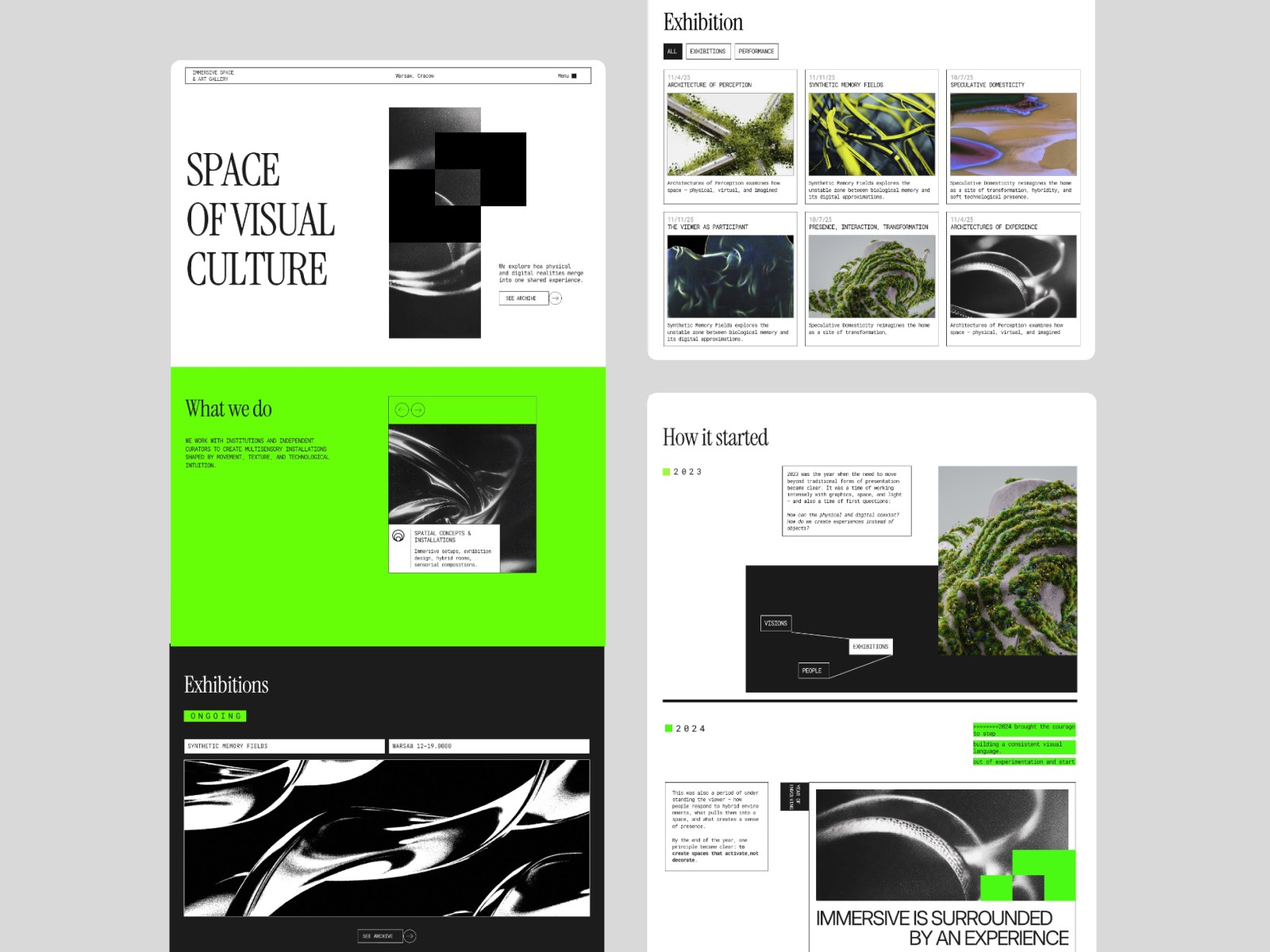 Immersive Art Space is a conceptual website project designed as a digital extension of a contemporary art gallery combined with a creative hub for artists. Inspired by immersive cultural spaces such as Wesoła in Kraków, the project explores how digital environments can reflect physical, experience-driven art spaces.